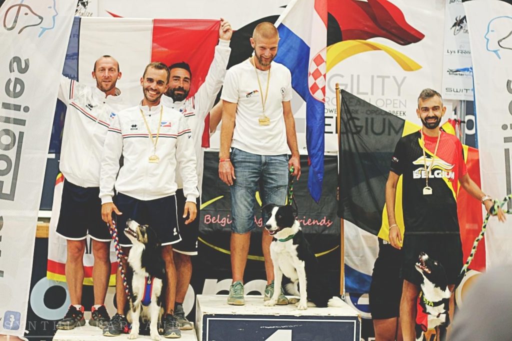 Côté résultat, le vendredi, avec les manches de qualification Équipe, se clôture avec 4 Équipes Qualifiées ! L’équipe Medium (Brenda et Fast, Jordan et Iscko, Thomas et Must ainsi que Patrick et Sky) offre à la France un très joli podium de manche ! Les 3 équipes Larges se hissent également en Finale avec, cerise sur le gâteau, l’Équipe Large (Cédric et Oz, Jeremy et Tiendness, Kevin et Move ainsi que Nordine et Ness) qui monte sur la Première Marche du Podium !!! Le drapeau tricolore flotte haut et les Français montrent bien que le niveau français est en pleine croissance ! Tendance confirmée le lendemain avec 12 équipes sélectionnés pour la finale ! D’autres, dont plusieurs équipes « novices » de cette belle Équipe de France, furent toutes proches ! Représenteront donc la France lors de la finale Individuelle du dimanche : en Small : Clémentine et Lucky, Karine et Ndjee ainsi que Maxime et Cute. En Medium : Solenn et Kinta, Thomas et Must ainsi que Jean-Paul et Neelen. Large : Claire et Xaa, Kim et Peeper, Cédric et Oz, Kevin et Move, Nordine et Ness ainsi que Jeremy et Tiendness. Le dimanche, les supporters français qui s’étaient déplacés nombreux ont mis le feu aux tribunes (nous imaginons bien également le nombre de personnes vibrant devant le live et sur les réseaux sociaux…). Les Français furent omniprésents ! Chacun se donnant à fond dans cette finale si exigeante… ce fut très proche du Graal ultime pour un bon nombre. Mais chacun d’entre eux s’est donné à son maximum et a joué le jeu pour provoquer la réussite ! On retiendra une belle 6ème place pour Ndjee et Karine… toutes proches du podium…Bref, dans cette European Open organisé avec brio par la Belgique dans le cadre exceptionnel du Sentower Park, notre Équipe de France s est battue et a vibré avec le public, témoignant, si besoin est, de la fierté de porter nos belles couleurs et de montrer la progression du niveau Français (dans une agility mondiale époustouflante). Un grand merci à la CNEAC, à notre partenaire SPECIFIC ainsi qu’à l’ensemble de nos donateurs (la compagnie de Leaxi, Albrest SASU). Nous ne saurons trop remercier également Jessica Flouret et Franck Barget qui ont fait le déplacement pour nous aider et veiller à ce que l’équipe soit dans les conditions optimales !