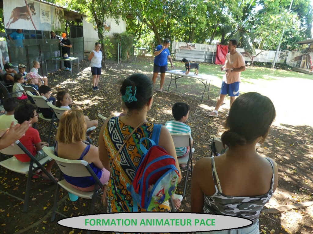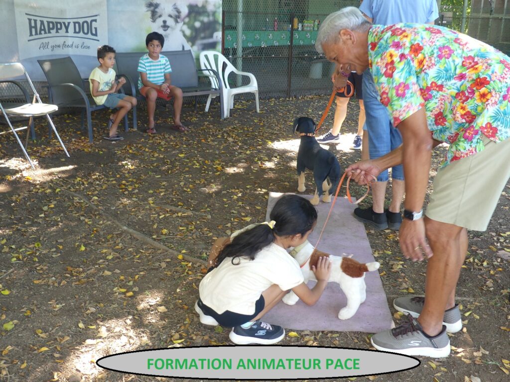 L’exposé de la formation d’animateurs pédagogiques PACE s’est déroulé également dans la salle de formation de la Polynésienne des Eaux. Nous avions rendez-vous au club canin de Pirae pour la journée « évaluation ». Belle mobilisation de la part de Véronique : 14 enfants ont été amenés par leurs proches. Une première sensibilisation avec les 14 enfants, le reste en petits groupes. Les enfants ont retenu des éléments importants parmi les conseils donnés. Véronique s’est chargée d’occuper les enfants durant le temps où d’autres participaient aux ateliers pratiques en respectant les consignes pour approcher sereinement un chien. Tous les animateurs présentés ont été reçus. Félicitations. Se sentir observés, animer avec de vrais enfants en présence de leurs proches, s’assurer d’utiliser un langage compréhensible par tous, ce n’est pas aisé ni facile, c’est un réel exercice réfléchi et adapté. Les enfants ont tous été attentifs, quel plaisir !