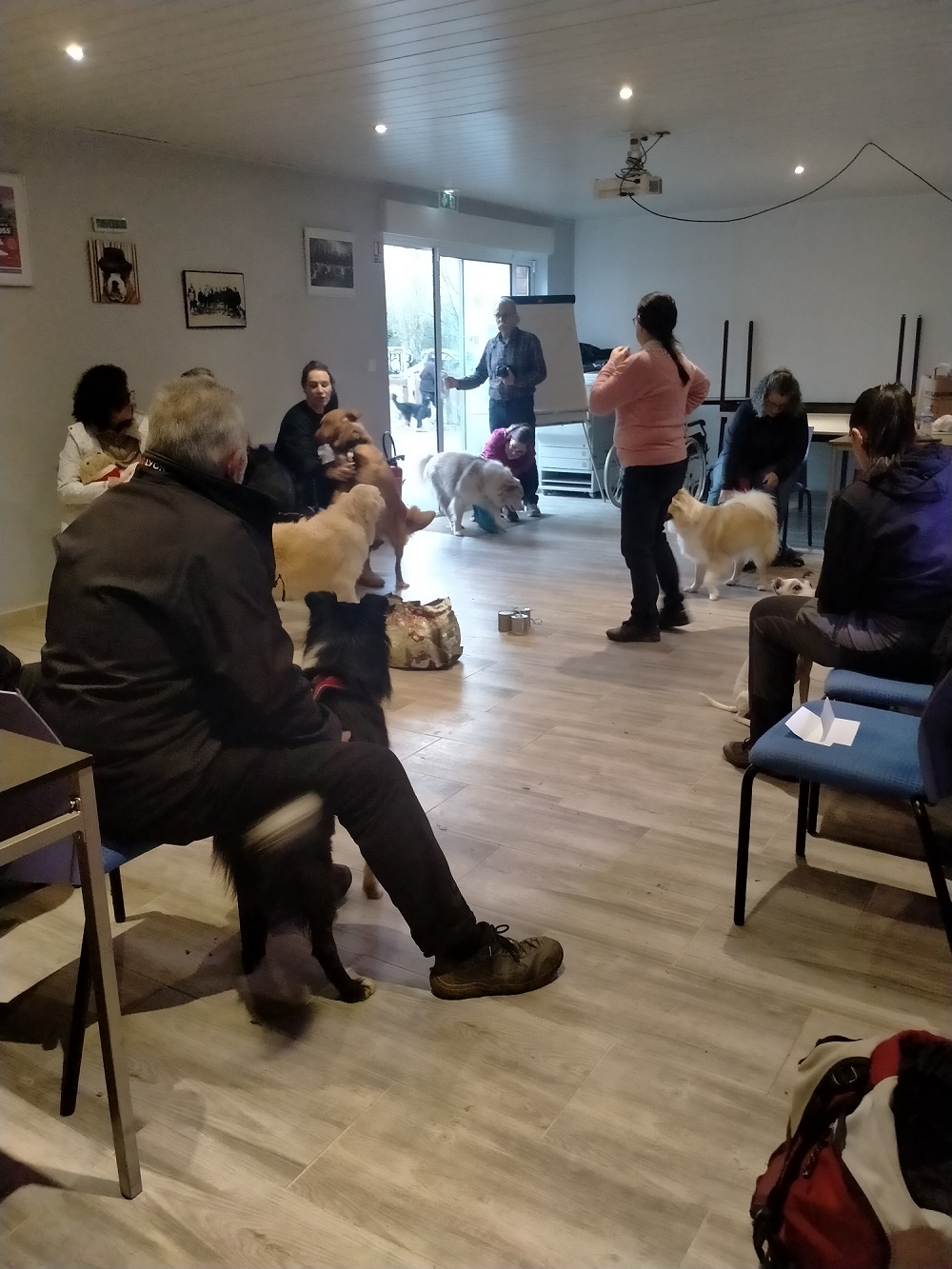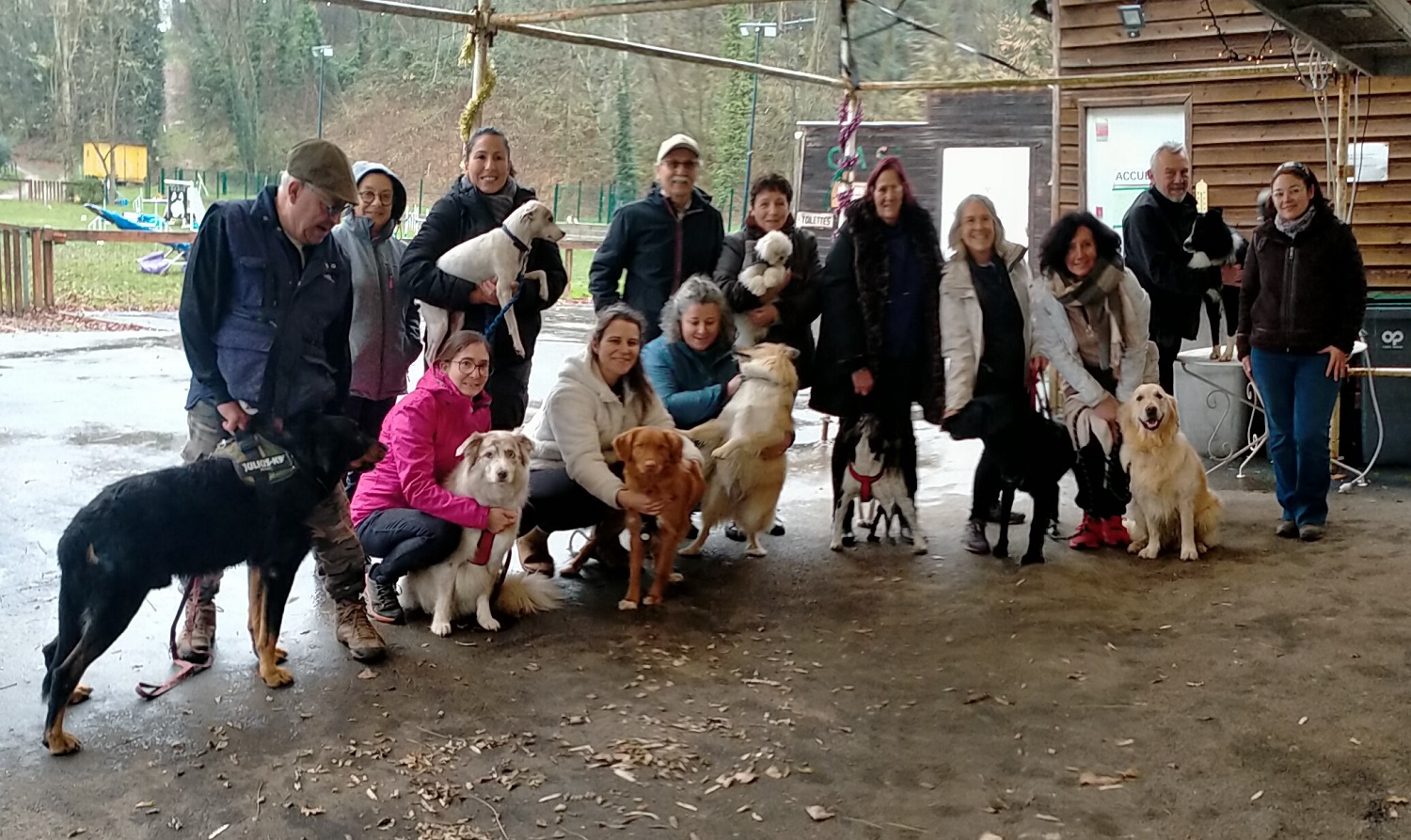 Un grand merci au Club Agility de Sainte Euphémie de nous (participants, bénévoles et formatrice) avoir aussi bien accueillis. Nous avons tous été choyés dès notre arrivée et jusqu’à notre départ. 10 chiens présentés : type beauceron, type berger Australien, Parson, Nova Scottia, Labrador, type beagle, border collie, berger islandais, golden retriever, et le plus petit : le bichon. Les humains et les chiens ont été très studieux tout au long de la formation. Les humains ont pris conscience de la complexité de cette discipline vis des vis de la vigilance qu’elle nécessite. La météo pluvieuse de la journée des évaluations a mis en évidence l’effort à fournir pour pouvoir présenter un chien « propre et sec » aux bénéficiaires. Merci aux participants de s’être inscrits à cette formation et de venir grandir la famille des Chiens Visiteurs.