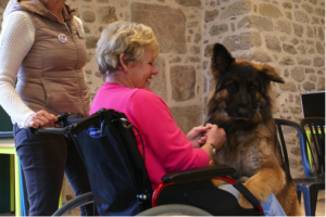 Aline Jean, l’actuelle Déléguée régionale de l’activité chiens visiteurs, nous a accompagné tout le week–end de sa présence amicale, n’hésitant pas à témoigner, donner des conseils, illustrer l’activité par des exemples concrets et même à interpréter les rôles de référent ou de résidente en fauteuil roulant, armée d’une béquille ou allongée dans un lit.