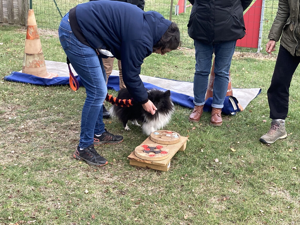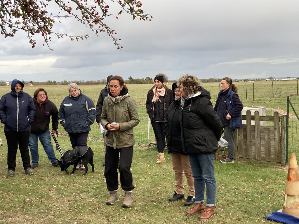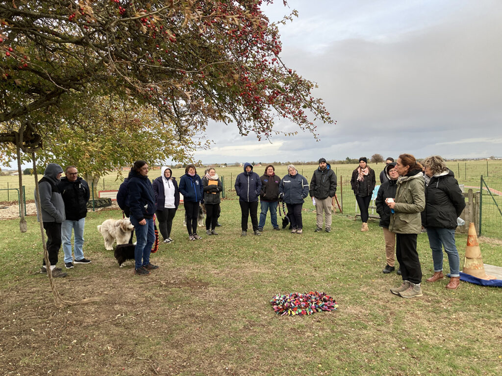 La suite était consacrée à de la pratique pour étudier : leur socialisation tant aux humains qu’aux autres chiots, leur éveil sensoriel, les apprentissages de base et les divers exercices à mettre en œuvre. Ce fut l’occasion de nombreux échanges entre formateur et stagiaires ainsi que d’analyser le langage canin lors des interactions entre chiots ou avec les humains.